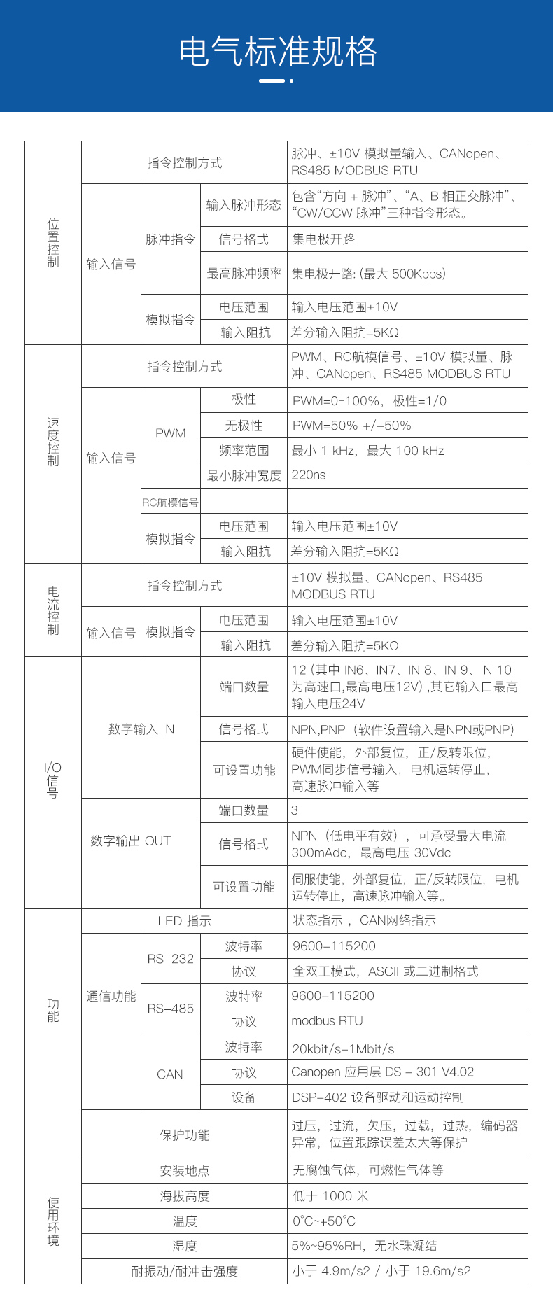 ?CAN2.0 局域總線(xiàn),兼容 CANopen DS-402,波特率最高 1MHz ;